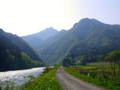 国道から分かれて郊外に出ると、田圃の向こうに鷲ヶ巣山の鋭峰が眺められる。三面(みおもて)川沿いの道を上流へ向かって走ると、鷲ヶ巣山と前衛の前ノ岳が急峻な山肌を見せ、雪解け水を川幅いっぱいに押し流す三面川を扼するように立ちはだかり、1000m級の山とは思えない威圧感がある。
