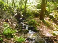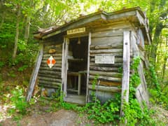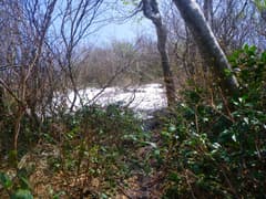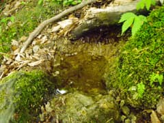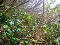 やがて尾根が広がって、鬱蒼としたブナ林と下生えのツバキ林に覆われた急坂を登ると、鷲ヶ巣山避難小屋に到着する。小屋の中は狭くて、非常時以外は泊まれそうにない。小屋のすぐ上の斜面に水場があり、ブナ林から浸み出した水がチョロチョロと流れている。