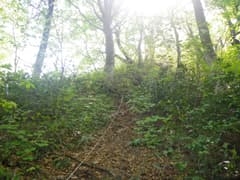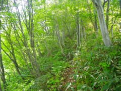 やがて根曲りの樹林と笹原に覆われた斜面をトラバース気味に下る道となる。道と言っても踏み跡レベルで、足元が傾いていて歩きにくく、体力を消耗する。歩き始めて既に3時間を超え、夜通しの運転による寝不足や酷暑もあって疲れが出てくる。いや、それよりもシャリバテが一番の原因か。ピーナッツラスクを食べて糖分を摂り、元気をちょっと回復。鞍部から標高差約220mの登りに取り付く。