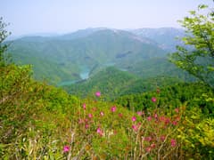 登り着いた前ノ岳の頂上には三角点標石がある。展望が開け、深い森林に囲まれた三面ダム湖の湖面を俯瞰する。目指す鷲ヶ巣山への稜線は、途中に中ノ岳を持ち上げて大きくアップダウンし、これを辿るのはなかなかのアルバイトになりそうである。