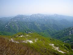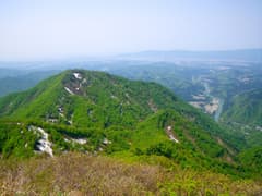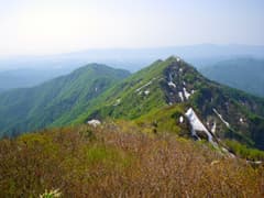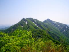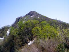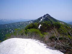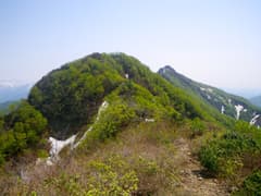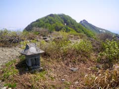 一休みしたのち、中ノ岳との鞍部に下る。陽当たりの良い低木帯ではタムシバが満開だ。鞍部にはブナ林の緑陰があり、見下ろす山腹には残雪があって涼める。ここから中ノ岳の最高点(1004m)へは標高差約320mの大登りとなる。ブナ林を延々と登って小ピークに着くと石祠があり、ここが中ノ岳のようだ。石祠の刻銘は読めないが、ガイド本によると薬師如来を祀っているとのこと。