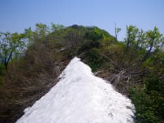 陽当たりの良い稜線を辿る。部分的に残雪があるが、問題はない。満開のタムシバを愛でながら急登すると、大日如来尊の石碑のある小ピークに着く。稜線に帯状に残る残雪を辿って、鷲ヶ巣山との鞍部に向かって下り始める。