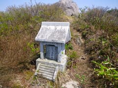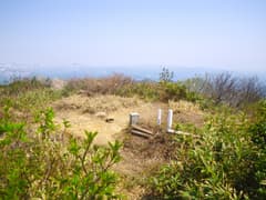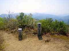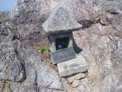 急坂をなんとかこなし、ようやく鷲ヶ巣山頂上に登り着く。頂上には大岩が点在し、新旧2基の石祠が祀られ、小平地の中央に三角点標石がある。