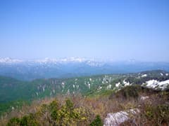 今日、登っているのは結局私だけのようで、正に360度の大展望を独占する。周囲には森林に覆われた尾根と残雪を鏤めた谷が幾重にも重なって広がり、その涯を画するように東には朝日連峰、南には飯豊連峰の白銀の峰々が囲繞する。この辺り一帯には顕著なピークは見当たらず、この鷲ヶ巣山と、明日登る予定の光兎山の鋭鋒が一頭地を抜いている。