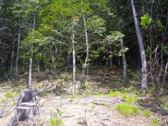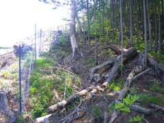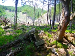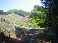 田保沢林道に入り、谷を奥に進むとすぐに谷はY字に分岐。左の谷間は大規模に伐採されて、真新しい防獣ネットが伐採地をぐるりと取り巻いている。破線路は左の谷間から正面の尾根に上がっているはずである。峠道、あるかなあ。嫌な予感がするなあ。