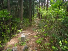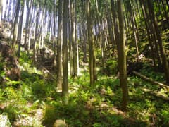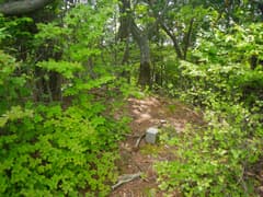 防獣ネットに沿って尾根を直登する案は、急な上に藪が酷いので却下。右の谷に林道が通じているので、それ辿って尾根の途中に復帰することにする。林道が右に曲がるところで、左の浅い窪を登る。杉の植林帯で藪はなく、ちょっとの頑張りで尾根の上に出る。