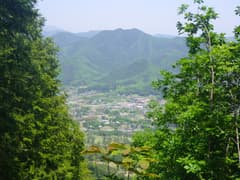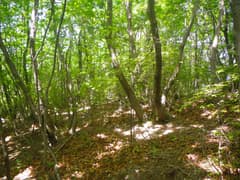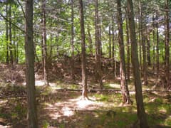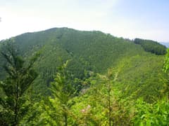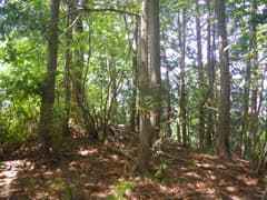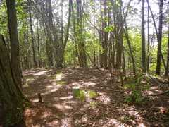 次は駒戸山に向かう。防獣ネットに沿って進み、ネットから離れて薄暗い杉林を抜け、雑木林を登る。雑木の新緑が綺麗だが、低木の小枝が少々煩い。駒戸山の頂上は周囲に盛り土をしたような平地となっているが、杉が植林されていて、城郭の遺構だかなんだか素人目には判然としない。まあ、城跡マニアでもここを訪れる人は稀だそうだ。頂上付近は南北に平坦なので、適当に陽当たりの良いところを探して休憩。パンを齧る。