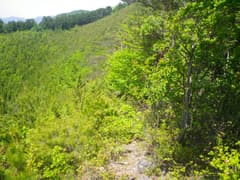 尾根上には防獣ネットと幾度も交差するように峠道の痕跡が続いている。峠道を横目で見ながらネットに沿って尾根を登ると、田保坂峠の弛みが見えてくる。