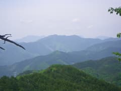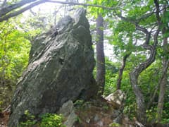 さらに市界尾根を辿ると、露岩が多くなりアカマツが現れる。木立の隙間から北西の眺めが開ける場所があり、鳴神山から残馬山にかけての山々やその奥に袈裟丸山を望む。