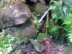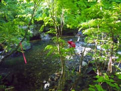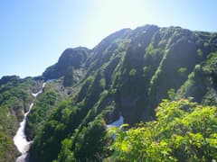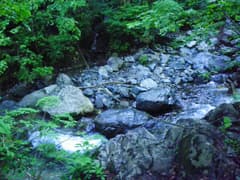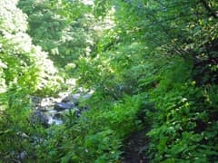 長かったジグザグの下りが漸く終わり、ヒロクボ沢に平行に下る道となる。途中に小さな水場があり、冷たい水で喉を潤す。緑深い山腹をトラバースし、雪渓のある小沢を横断すると、往路との分岐点はすぐそこである。あとは北沢を渡渉し、杉林の中を緩く下って登山口に戻る。登山口の駐車場の車は半分くらいに減っていた。