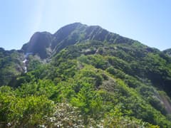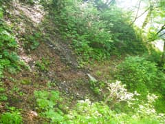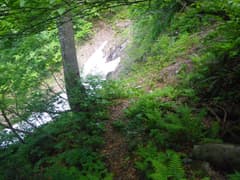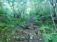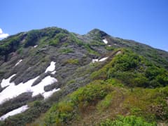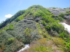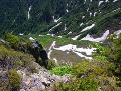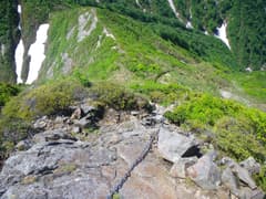 下るにつれて斜度が増し、ジグザグ道もところどころで崩壊地の縁を辿る。さらに下ると、雪渓のある谷に沿って下る道となる。雪が残る時期にはアイゼン、ピッケルが必要になりそうなルートである。雪の消えた斜面には、シラネアオイやサンカヨウが咲いている。