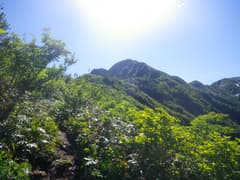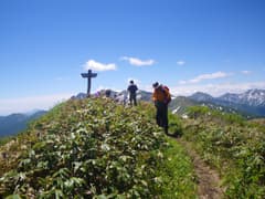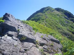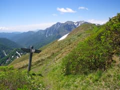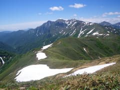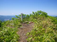 小さなピークを2、3越えると、シシゴヤノ頭の頂上に着く。笹原の尾根からの大展望は、ここで見納めとなる。水を飲んでしばし休憩する。