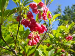 目指す大源太山は左側(北西面)が切れ落ちた険しい山容を示している。尾根を見上げると、先行するハイカーさんが登っているのが見える。道端にはアカモノの花が多く、ねじくれたネズコが冬の積雪の多さを語っている。鎖の付いた岩場を越え、尾根を急登すると、大源太山の頂上に着く。