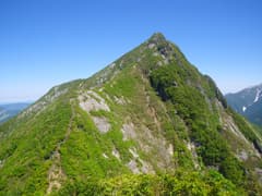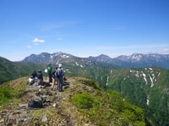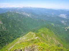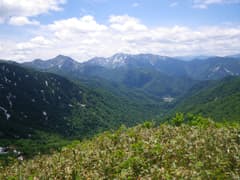 頂上からは360度の展望が開ける。5人程のハイカーさんが居て、見える山の同定で賑やかだ。しかし、聞こえてくる山名はちょっと間違っているかもよ(^^;)。頂上から北には険しい稜線が延び、その先には七ッ小屋山がゆったりとした山容で横たわる。その右に見えるのは茂倉岳、一ノ倉岳、さらに金字形の山容が鋭い万太郎山や仙ノ倉山へと続く。