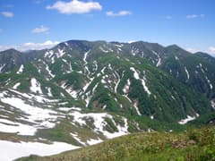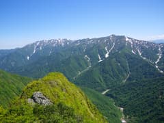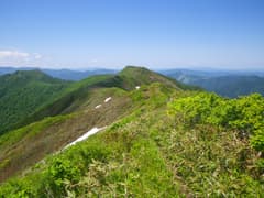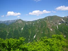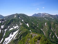七ッ小屋山の左には朝日岳の大きな山塊がある。そのさらに左には上越国境稜線が緩やかに連なり、途中に檜倉山と柄沢山を起こして巻機山に至る。朝日岳〜巻機山は残雪期に縦走したいと思っているところなので、双眼鏡でじっくり眺める。登ってきたヤスケ尾根を振り返れば高度感があり、湯沢市街や、彼方に妙高山、火打山を遠望する。