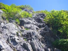 直進すると枝沢を横断する個所があり、対岸は出水で抉られたのか崖となっていて、アルミ梯子で登って越える。再び北沢の渡渉があり、ロープと飛び石で右岸に渡る。赤テープと道標を目印にして山腹を登る道に取り付き、かなり急で滑りやすい斜面を一直線に登る。ここの登りはなかなかきつい。