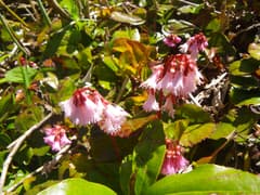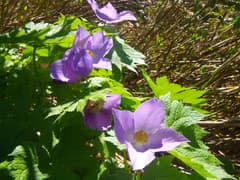 小さなアップダウンがあり、1544m標高点から分岐して、シシゴヤノ頭への尾根に入る。この尾根も笹原に覆われて、展望が良い。少し笹は深くなるが明瞭な道型が続く。左手には蓬峠から蓬沢へ下る登山道が笹原の中にくっきりと見える。蓬沢の下方には土樽PAが見え、その後方に万太郎山と仙ノ倉山を望む。この尾根でもあちこちにシラネアオイが咲いている。