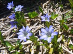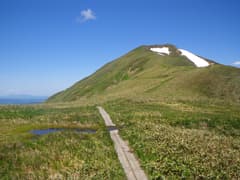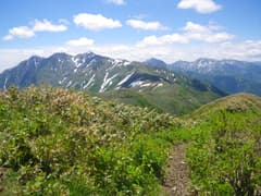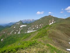 昼食後、七ッ小屋山から蓬峠方面に向かう。笹原の広がる円やかな稜線からの広闊な展望を楽しみながら、のんびり歩く。七ッ小屋山から雪田の横を緩く下ると小さな池塘がある。湿原の花にはまだ時期が早いが、付近の道端にはタテヤマリンドウやツマトリソウが咲いている。コバイケイソウの青々とした葉も出ているが、まだ蕾だ。