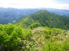 痩せ尾根を下り、七ッ小屋山への登りにかかる。振り返ると大源太山の鋭鋒がすっくと聳えて格好良い。行く手の七ッ小屋山の斜面を覆う笹原の中には、ジグザグに登る道型が見える。かつての峠越えの道だろうか。登山道はジグザグの道型の横を直登する。道端にはイワカガミやシラネアオイが咲く。登り着いた草原の台地は、古いガイドブックによると、大畠と呼ばれている。