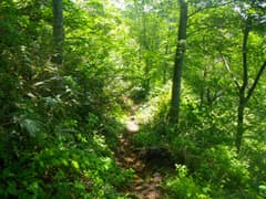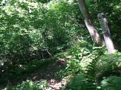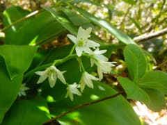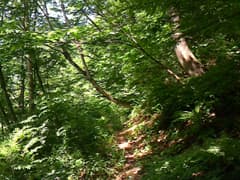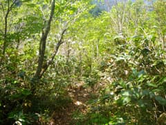 地形図にはシシゴヤノ頭からコマノカミノ頭へ向かう破線路が記載されているが、実際には密藪に覆われて道はない。笹原の尾根を下り、すぐに樹林帯に入る。等高線の間隔からも容易に分かるが、かなりの傾斜の山腹を下る。しかし、道は大きくジグザグを切っているので、意外と歩き易い。ところどころで終盤のタムシバを見る。