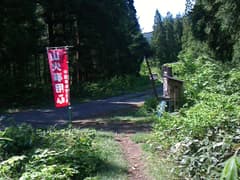 沢沿いの道を進むと、「謙信ゆかりの道入口」の道標があり、右に登山道が分岐する。帰りはこの登山道を降りてここに戻ってくる予定。
