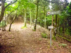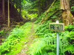 やがて山腹をトラバースする道となり、シダに覆われた谷を詰め上がって稜線に出る。杉の大木が二本並び立ち、「二本杉」と「二合目」の標識がある。なお、古い標識もあり、それには「一合目」とある。前掲の米原市HPの案内でもここは一合目となっている。以降も新旧の標識で合目が食い違うことがあるが、この記事では新しい標識に基づいて合目を記すことにする。