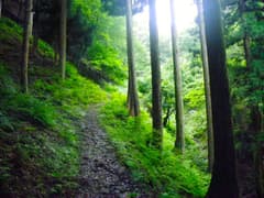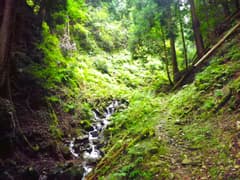 下山は往路を戻る。緩い山稜の下りは楽チンで、行程が捗る。途中、四合目で女性2人組とすれ違う。二合目の二本杉から沢沿いの山道を下り、途中の湧き水で冷たい水を飲んでホッと一息つき、さらに下ったところでアクシデント発生。トレラン用シューズは滑り易いので注意して歩いてはいたのだが、濡れた岩を踏んだ瞬間に、なんの摩擦もなくスリップ。前に倒れ込んだ先に倒木があり、右腿の前面と右肘を強打する。これは痛かった(>_<)。幸い、骨折とかはなく、打撲で済んだようだ。しばらく休んだのち、右脚をかばいながら再び歩き出す。林道まですぐの地点だったのも幸運だった。