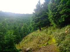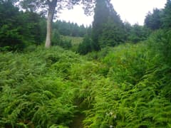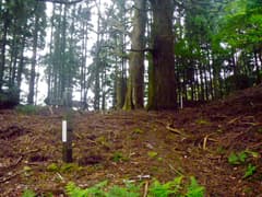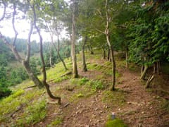 四合目から少し下るが、直ぐに登りに転じて、若いヒノキの植林帯をゆるゆると上がる。周囲にはヒノキ林に覆われたなだらかな山並みが広がる。左山腹をトラバースすると五合目の標識があり、シダにびっしりと覆われた浅い窪を登る。ここは流水あり。再び稜線上の道となり、下生えにシダやコケの多い稜線を緩く登る。この辺り、疎らな樹林の間の陽当たりが良くて乾燥した斜面もシダに覆われており、ちょっと珍しい植生ではないかと思う。地質や気候に原因があるのかも。
