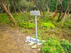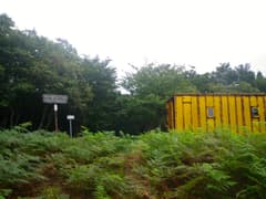 ここから緩やかな稜線上の道となる。暫く登ると右山腹を巻き始め、小さな沢を横断する。再び稜線上に戻り、アセビなどの樹林に囲まれた道をゆるく登る。三合目の標識を過ぎ、シダが下生えの尾根を登ると、避難小屋が建つ小ピークに登り着く。ここが四合目だ。小屋と言っても鉄道のコンテナ?を置いただけの物で、雨風は辛うじて凌げる。