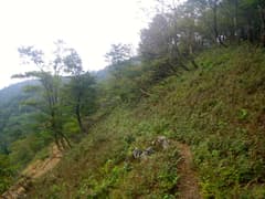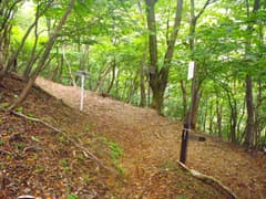 六合目の標識を過ぎ、やがて920m標高点を巻いて右山腹のトラバース道に入る。緩やかな山稜が続くが、登山道はその左を巻いたり、右を絡んだりして、なかなか省力的かつ変化のあるコース取りがされている。右に河内への道を分け、稜線を乗り越して左山腹のトラバース道となると、直下に作業道が通じている。