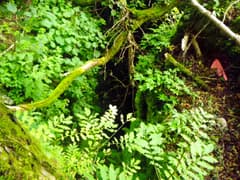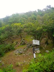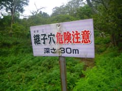 やがて七合目に着くと、「継子穴危険注意深さ30m」という看板がある。これはどんな穴だろう。踏み跡を辿って山腹を登ると、林の中のロープで囲まれた一角に狭い縦穴の口が開いている。中を覗いても真っ暗で底は見えない。こいつは深そうで、確かに危険だ。剣吞、剣吞。これもカルスト地形の一つだろう。
