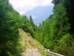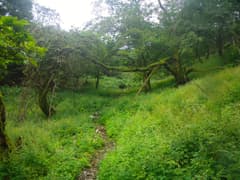 砂防堰堤の横を通り、谷の奥へ進む。やがて林道終点となり、一合目の標識がある。ここから山道に入り、狭い谷に沿って登る。急な山肌が、なかなかワイルドな雰囲気。