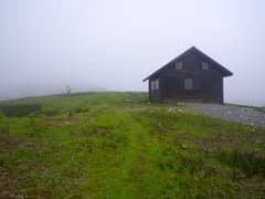 柏原駅からここまで2時間半。時間はそれほどかかっていないが、緩やかな山稜を延々と辿って、長い距離を歩いた感がある。霊仙山の山頂まではもうちょっとだ。滑り易い急坂をロープを頼りに登り、無木立でシダに覆われた緩やかな稜線を辿ると、霊仙山避難小屋に着く。新しく立派な小屋で、晴れていれば展望も良さそうだが、今日は残念ながら霧に囲まれて展望は何も見えない。