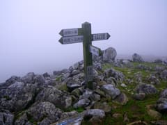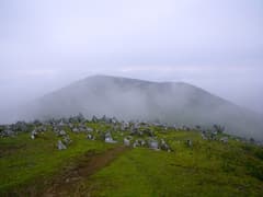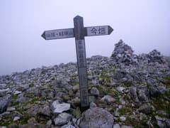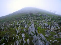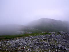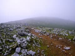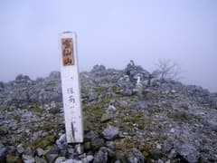 カレンフェルトの稜線を辿って、三角点標石のある霊仙山頂上に着く。ここで大休止とし、パンの昼食をとる。霧に閉ざされて、相変わらず展望はなし。風に吹かれて一瞬、霧が薄くなり、お隣の最高点のピークが眺められた。霧の中で話し声がすると思ったら、10名弱の若者のグループがやって来て、一時、山頂は賑わう。しかし、彼らが去ると、静寂の山頂に戻る。さて、最高点にも立ち寄ってみよう。