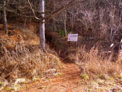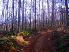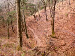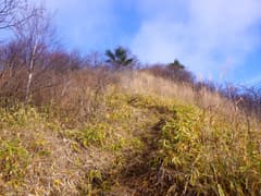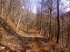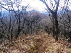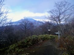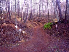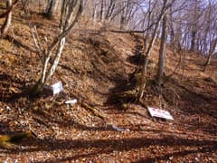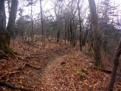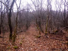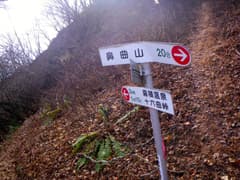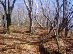林道を横断すると「←きりづみ温泉」の道標があり、山道に入る。カラマツの落ち葉に覆われた道をしばらく辿ると、落葉した雑木林の中の道となり、右山腹をトラバースして山間に入って行く。やがて、鼻曲山への直登コースと鼻曲峠への巻き道コースの分岐に着くが、後者は崩壊のため通行止となり、廃道化している。