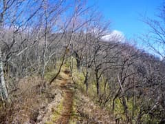 ここから道は斜度をちょっと増す。山腹を斜めに上がり、尾根上に出て冬枯れの明るい雑木林の中を登る。行く手に鼻曲山の頂上付近を仰ぎ、右手には鼻曲峠辺りの県境稜線が既に同じ位の高さに見える。