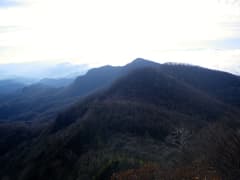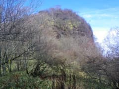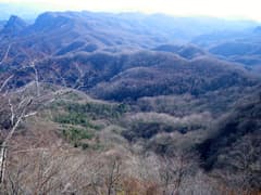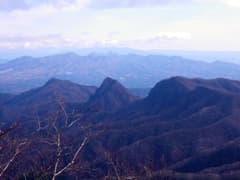 頂上の北面は樹林に遮られて展望はないが、東面から南面にかけて眺めが開ける。東面は山名の由来となった岩壁が切れ落ち、烏川源流域の森林を俯瞰して、角落火山群の雨ん坊主、角落山、剣の峰の三座が並んで見える。いずれも登ったことのある山だが、また登りたくなるような怪蜂と言って良い個性的な山容をしている。その後ろには榛名山、遠くには赤城山の山影を望み、関東平野を見渡す。