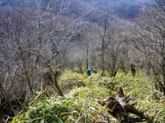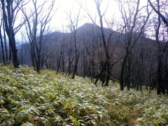 留夫山からは大下りとなる。疎らな雑木林に覆われた尾根の下りは最初は急だが、やがて広い斜面の緩い下りとなる。行く手には一ノ字山がこんもりと盛り上がり、振り返れば留夫山が端正な金字型の山容で聳える。高原的な雰囲気のある鞍部から1419m標高点まで少しの登りがあるが、その先は広く平坦な尾根を直進してゆるゆると下る。足にお任せで歩ける楽な道で楽しい。