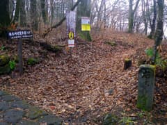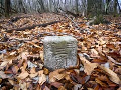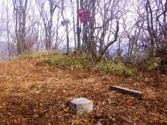 登山道が左にカーブして降り始めた地点で、右側の雑木林に入って一ノ字山の三角点標石(点名、一ノ字)を探す。GPSに登録しておいた三角点の位置がいい加減だったので、探すのにあちこち歩き回って手間取ったが、積もる落ち葉の中にようやく見つけ出す。