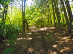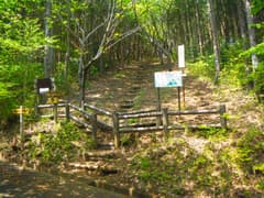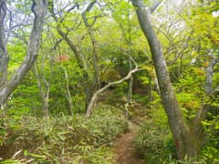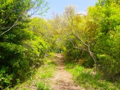 腹を満たしたところで、後半の行程に入る。新緑に覆われた尾根をグングン下ったのち、急坂を登り返すと、右にすずらん群生地への道を分ける(下り20分)。スズランが咲くのは5月上旬とのことなので、もしかしたら咲いているかな。いずれにしても、往復するには遠いので割愛。