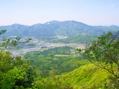 緩く見えた吾国山だが、登り始めると結構急だ。林道を横切り、擬木の階段を急登する。尾根上に出ると一旦傾斜が緩み、右(北東)斜面が伐採されて、新緑に覆われた山(館岸山の峰続き?)や平野の展望が開ける。