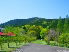 尾根上の林道に平行する歩道を辿ると芝生の広場に出て、正面になだらかな吾国山が現れる。左に建ち並ぶ赤い屋根の建物は、かつての「吾国山洗心館」と称する青少年教育施設だが、H20年度末で閉鎖されて立入禁止となっている。しかし、まだ最小限の手入れはされているようだ。