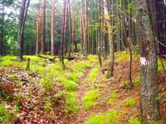 赤松と杉檜に覆われて展望のない尾根を坦々と登る。単調で退屈な登りの中で、町有林丸岩払下記念碑は唯一と言って良いランドマーク。ジグザグに登ると雑木林に入り、緩く広い尾根を辿る。この辺りは気持ち良く歩ける区間だが、登高能力テストのコースとしては標高が稼げなくて不利に働くかも知れない。