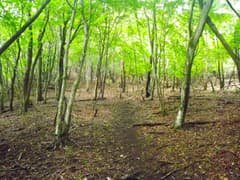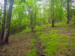 頂上の手前には急坂がある。以前は丈の低い笹原が下生えに広がっていた覚えがあるが、現在は笹原は消えて、笹の新芽がポツポツと出ている程度である。