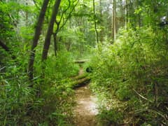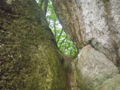 三番岩からの縦走路も樹林の中に岩場が連続し、巻いたり岩の割れ目をすり抜けたり、変化のある道が続く。それにしても今日は暑い。稜線上では少しは涼しい風が吹くかなと期待していたのだが、ほとんど無風で湿度が高い。標高差100mしか登っていないのに大汗をかいて、既にグロッキー気味。途中のベンチで休憩して、ペットボトルのお茶を飲む。