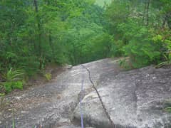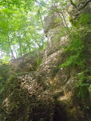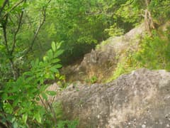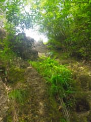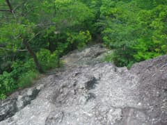 3ピッチ目は上から見ると垂直に近い。鎖は浅いU字状ルンゼの中に張られており、岩の表面が湿っていて滑り易い。ここが一番危ないと思う。ロープの長さギリギリで懸垂下降する。4ピッチ目で樹林中の急斜面を5mほど懸垂下降して、安全圏に下り着く。いやー、この鎖場は面白かった。難所とは聞いていたが、長く急で、予想以上の難所だった。妙義山系の鎖場と比較しても高難度と思う。