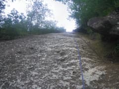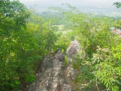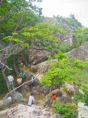 さらに進んでようやく下界の喧騒から離れると岩場が現れる。急な個所には丁寧にステップが刻まれ、登るのは易しい。稜線に向かって岩場を登り上げると、右の岩峰(A峰)の上からクライミングロープが垂れ下がっている。ロッククライミングの練習に来ている人がいるようだ。