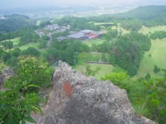 「クサリ場」あるいは「クサリ場・迂回ルート」というプレートに導かれて猿岩に向かう。大きな岩屋を過ぎると細尾根となり、左に迂回ルート(鎖場の下に抜ける)を分ける。少し下った岩稜の突端が猿岩だ。正面は切れ落ちて、眼下にゴルフ場の芝生とクラブハウスを俯瞰する。そして左のスラブが問題の難所、猿岩の鎖場だ。