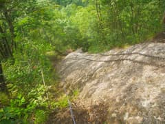 この鎖場は、上部の斜度はさほどでもないが、途中から急になって、下が見えない。しかし、よく見ると下に立ち木があり、その根元がテラスになっている。念のために30mロープとハーネス、エイト環を持って来ているので、無理せず懸垂下降で行くことにする。ロープを垂らすとギリでテラスに届いたので、1ピッチ目は15mあることになる。