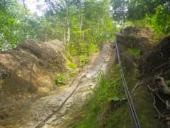 テラスまで降りると、さらに鎖場が続く。2ピッチ目は立木の根っこを支点にし、途中の足場の良いところまで7mくらい下る。